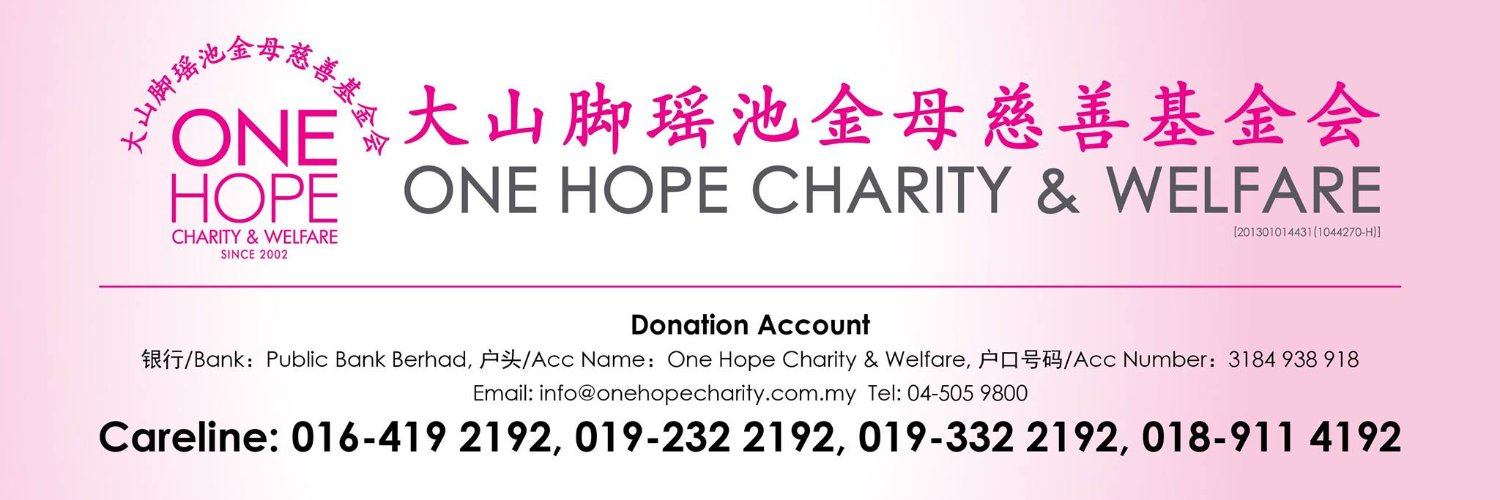ONE Hope Charity and Welfare Berhad donated close to RM1mil of food and daily necessities to 3000 families of various races. ONE HOPE CHARITY WELFARE BERHAD. TO WORK WITH CHARITABLE ORGANISATION TO PROVIDE AND ACTER FOR THE NEEDY.